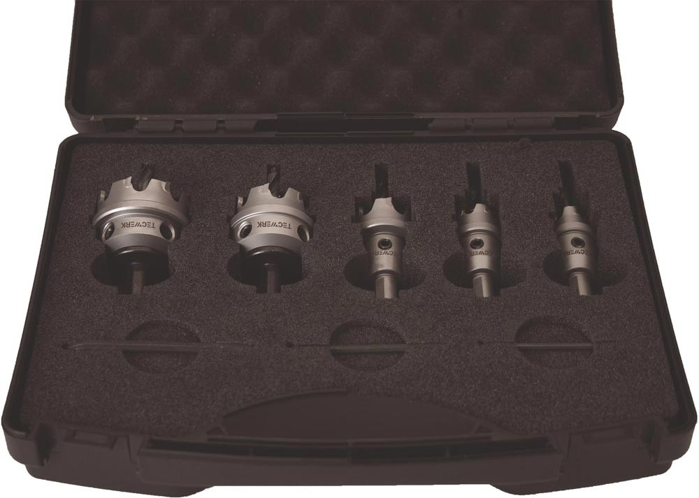 Flachschnitt · hartmetallbestückte Schneiden erlauben mehrmaliges Nachschleifen · auswechselbarer Zentrierbohrer · Auswurffeder für den Bohrkern für Materialstärken bis 4 mm bei unlegierten Stählen · Edelstahl bis 2 mm · Schnitttiefe 4 mm · Inhalt: