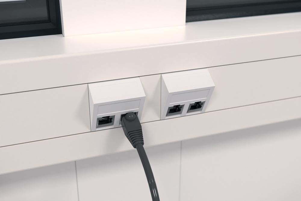 Das optionale Elektropaket "Starter" bringt moderne LED-Beleuchtung, einen Wandkonvektor sowie Strom- und Netzwerkanschlüsse in das Raummodul. Für eine perfekte Büroumgebung sorgt das Elektropaket "Office" mit zusätzlichen Steckdosen, Netzwerkanschlüssen und einer optimierten Beleuchtung für Computerarbeitsplätze. Das Paket "Mini" beinhaltet LED-Deckenunterbauleuchte, Zweifachsteckdose und Elektro-Wandkonvektor