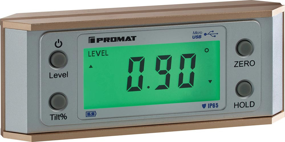 digital · IP65 · Gerät zur Messung von Ebenheit, Rechtwinkligkeit und Winkligkeit · Präzisionsauflageflächen im Aluminiumrahmen · Anzeige umstellbar von Winkelgrad auf Winkelprozent · mit Hold-Funktion zum Festhalten des Messwertes · große LCD-Anzeige mit Ein-/Ausknopf und Nullstellung in jeder Position möglich · mit integriertem Akku (3,7 V 400 mAh Li-Ion 6020), Ladezeit ca. 40 min