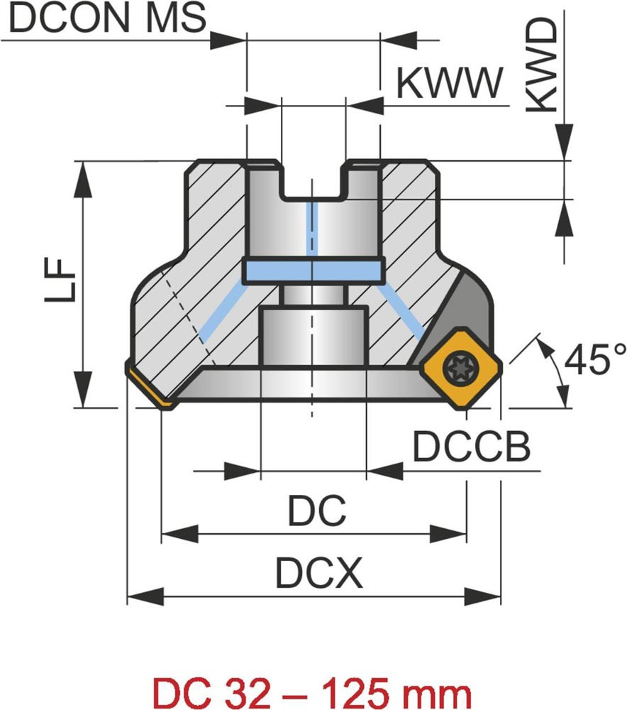 Planfräser mit positiver/negativer Geometrie zum spannen von 9 Stück SEET 09T3AF.. oder SEMT 09T3AF.. einseitigen Wendeschneidplatten · Schnittdurchmesser 125 bis maximal 134.5mm mit 45° Anstellwinkel und 40mm Verbindungsbohrung gemäß DIN 8030-A · 63mm Überstandslänge · Kühlkanalbohrung und ungleiche Teilung zum Planfräsen und Entgratfräsen mit einer maximalen Schnitttiefe von 4.5mm