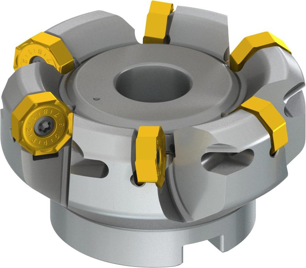Planfräser mit doppelt negativer Geometrie welche 6 aus ONMX 0605.. · ONMX 0605..-W oder SNMX 1705.. doppelseitige Wendeschneidplatte · Schneiddurchmesser 80mm bis maximal 90,8mm mit 43° Anfahrwinkel und 27mm Bohrung gemäß DIN 8030-A · 50mm funktional und · durchgehende Kühlung und ungleicher Teilung zum Planfräsen und Entgratenmit einer maximalen Schnitttiefe von ON.. 4mm · SN.. 7mm