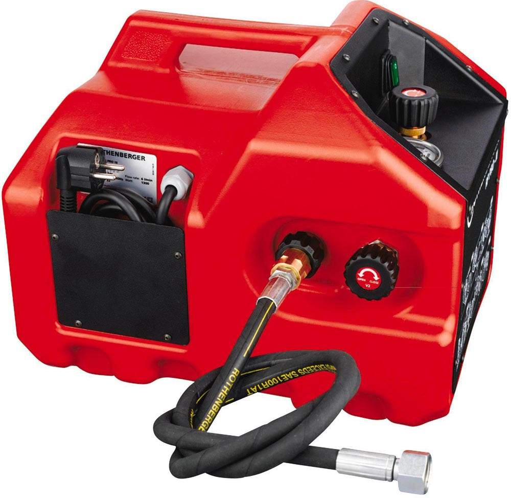 selbstansaugende elektrische Befüll- und Prüfpumpe bis 40 bar · komfortables automatisches Befüllen und Abdrücken von Leitungssystemen und Behältern · kompaktes und robustes Kunstoffgehäuse für einfaches Handling auf der Baustelle · Flüssigkeitszufuhr frei wählbar: selbstansaugend oder aus einer Druckquelle · geeignet für Öl, Wasser, Glykol · mit Stahlgewebe verhindert Messfehler, die durch Aufweiten des Schlauches im Betrieb entstehen können · glyceringedämpftes Manometer gleicht Druckstöße aus, dadurch einfaches Ablesen des Drucks · Prüf- und Druckbereich