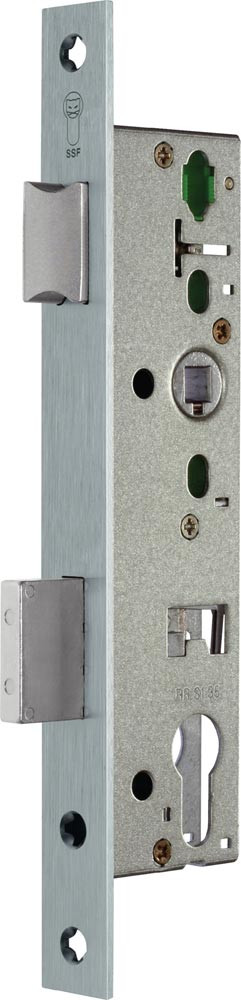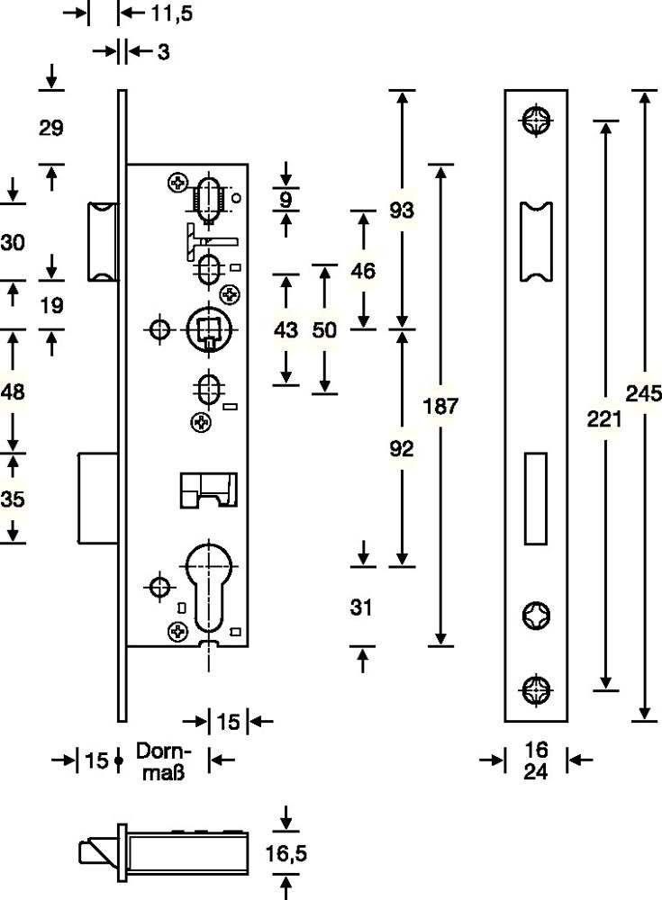 Schlosskasten aus Stahl oben und unten geschlossen · durchgehende Beschlagbohrung oberhalb der Schlossnuss · Späneschutzhülsen · 1-tourig mit stabilem Riegel · Riegelausschluss 15 mm · DIN links und rechts verwendbar · Anschlagrichtung umstellbar · vorgerichtet für Profilzylinder, mit Wechsel · Entfernung 92 mm · 8 mm Klemmnuss · Falle und Riegel vernickelt · Stulp auf Mitte · Stulplänge 245 mm · käntig · Hinterdornmaß 15 mm · Klassifizierungsschlüssel nach EN 12 209 vorhanden