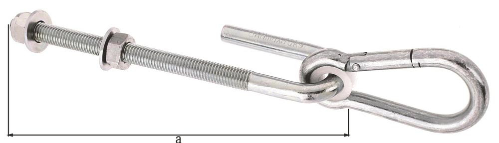Material: Stahl, Oberfläche: galvanisch verzinkt, dickschichtpassiviert · zum Durchschrauben · Karabinerhaken nicht einzeln erhältlich · Aufgrund von Umstellungen der Oberfläche kann dieser Artikel in unterschiedlichen Ausführungen (gelb-verzinkt, sendzimirverzinkt oder verzinkt-dickschicktpassiviert) geliefert werden.
