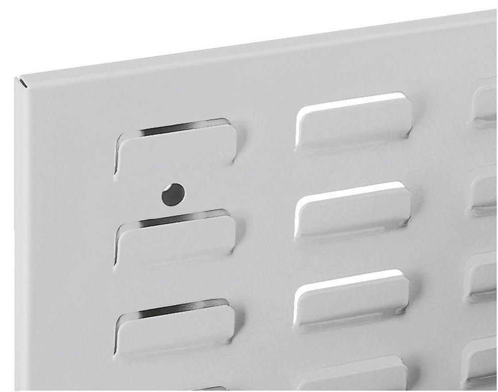 Querformat · variabel einsetzbar · ideal zur Befestigung an Wänden, Werkbänken oder einsetzbar als freistehende Trennwände (auf Anfrage lieferbar) · Schlitzplatten aus 1,25 mm starkem Stahlblech · pulverbeschichtet · rundum abgekantet und mittels Unterzüge verstärkt
