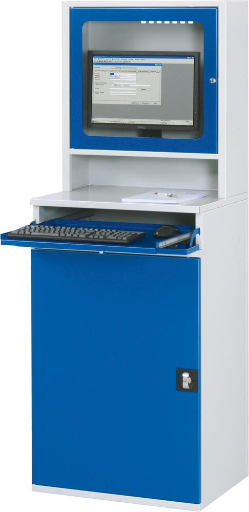 · Zur optimalen Unterbringung von Dokumenten, Computern und Peripheriegeräten · Stabile, verwindungssteife Stahlblechkonstruktion · Unterbaugehäuse, geteilt in Tastatur- und Flügeltürfach, getrennt von einander verschließbar · Tastaturfach mit Klappe: Fachhöhe 120 mm, dahinter ein Auszugtablar zur Auflage der Tastatur sowie der Maus · Flügeltürfach: Fachhöhe 850 mm, Türöffnungswinkel ca 225°, Nutztiefe 500 mm · Diverse Kabeldurchführungen an der Gehäuserückseite, im Deckel und im Innenteil · Lackierung: Gehäuse RAL 7035 lichtgrau, Front RAL 5010 enzianblau · Lieferung komplett montiert