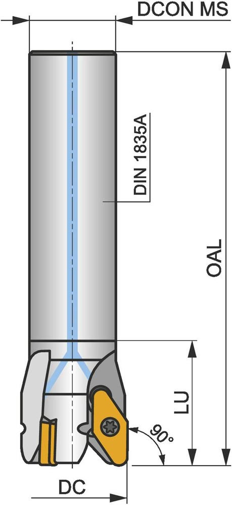 Schaftfräser mit doppelt positive Geometrie zum spannen von 2 Stück VCGT 220530F-FA einseitigen Wendeschneidplatten · Schnittdurchmesser 32mm mit 90° Anstellwinkel und 25mm Zylinderschaft gemäß DIN 1835A · 120mm Gesamtlänge · Kühlkanalbohrung zum Helikalen Fräsen und progressiven Eintauchen mit einer maximalen Schnitttiefe von 3.0 (16.0)mm