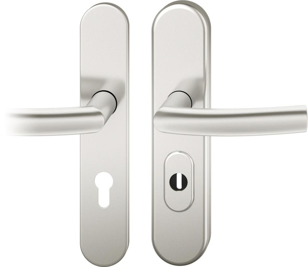 Langschild-Garnitur · für Außentüren · geprüft nach DIN 18257 · außen gekröpfter runder Flachknopf · innen Türgriff fest/drehbar gelagert · Drückerausführung FSB 1107 · verdeckte, durchgehende Befestigung · Lochung PZ, mit Zylinderabdeckung · Türstärke 67-69 mm · DIN links / rechts · Widerstandsklasse ES 1
