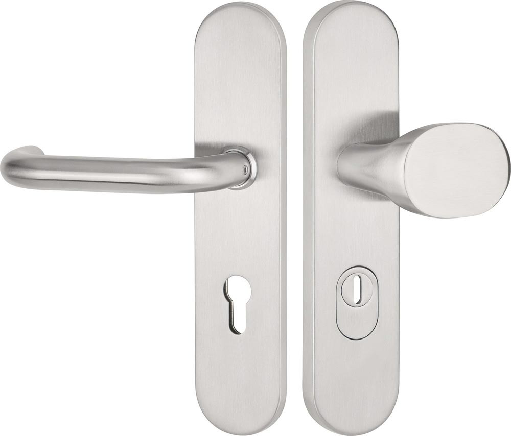ZT-EN2 Wechselgarnitur mit Langschild 2089 KS, Knopf 3128 gekröpft · Außenschild bestehend aus Stahl Unterkonstruktion mit gehärteter Außenplatte und Edelstahl Dekor-Abdeckschild, unsichtbar verschraubt · gehärtete Stahlnocken zur Aufnahme der Gewindeschrauben · 3-fach M6 Verschraubung mit Stahlschrauben und Gewindestopp · Knopf links / rechts verstellbar mit integrierter Verdrehsicherung · Innenschild mit Stahl-Unterkonstruktion und Edelstahl Dekor-Clipschild unsichtbar verschraubt · Drücker fest gelagert · Ausführung KS: Kernziehschutz federnd gelagert, dadurch stufenlose, automatische Anpassung an die Profilzylinderlänge · geprüft nach DIN 18257 – ES 1 · Zylinderüberstand 8-15 mm