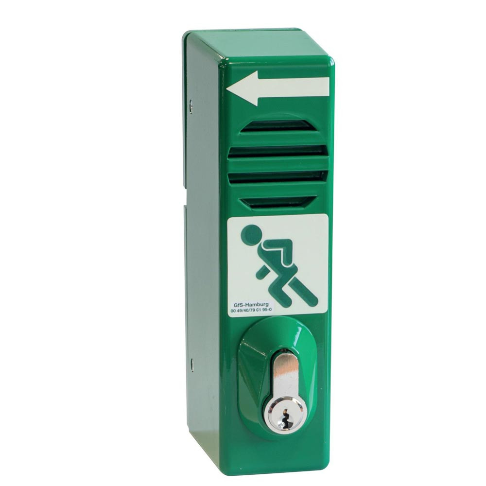 Die Tür lässt sich nur öffnen, wenn vorher der Türwächter zu Seite gedreht wird. Er rastet dann in seiner Schrägstellung ein und gibt der Klinke den Betätigungsweg frei. Gleichzeitig ertönt ein lauter akustischer Alarm. Das bedeutet: Die Tür kann bei Gefahr geöffnet werden, das Alarmsignal macht jedoch auf eine unbefugte Benutzung aufmerksam.
