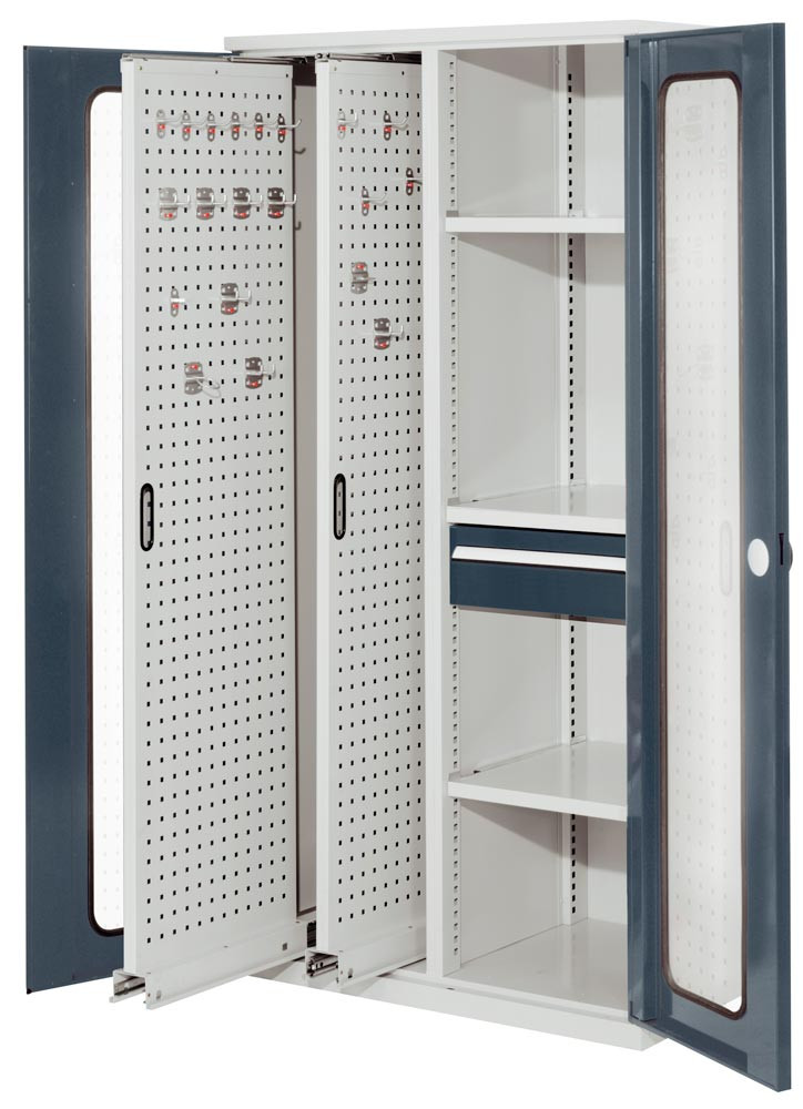Schwerlastschrank, Sichtfenstertüren, 2 Vertikalauszüge, 3 Fachböden, 1 Schubl. BxTxH 1000x600x1950 mm, RAL 7035 / RAL 7016