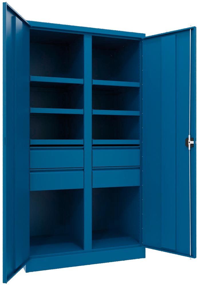 Schwerlastschrank, Vollblechtüren, ohne Trennwand, 3 Böden, 200 kg Traglast, 2 Schubl. 175 mm, BxTxH 1040x630x1950 mm, RAL 5010 E6490150