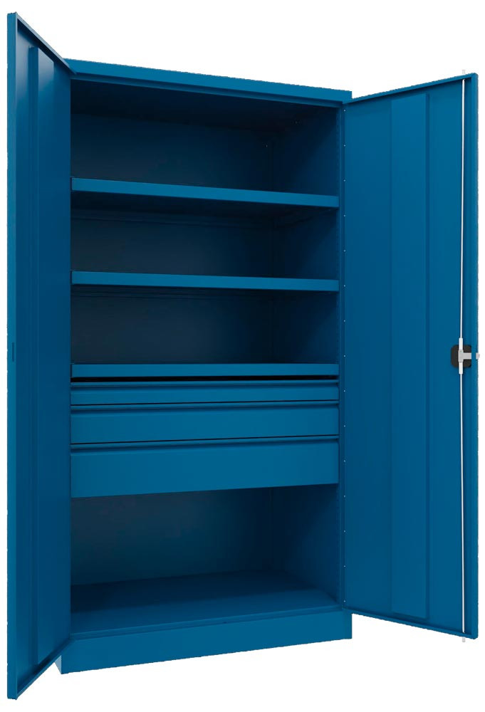 Schwerlastschrank, Vollblechtüren, ohne Trennwand, 3 Böden, 200 kg Traglast, 2 Schubl. 175 mm, BxTxH 1040x630x1950 mm, RAL 5010 E6490150