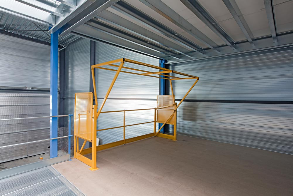 Sicherheits-Palettenschleuse, mit Seitenschutz, für Palettenhöhe max. 1,80 m, Breite 1500 mm, Höhe außen 2250 mm, Farbe RAL 1028 melonengelb