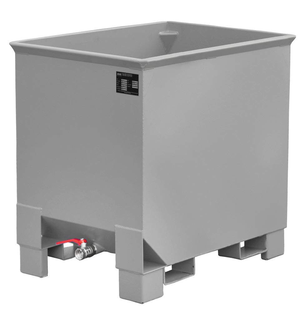 · Robuste Stahlkonstruktion mit glatten Innenwänden · Öl- und wasserdicht · 3-fach stapelbar auf 4 Stapelecken · Entleerung mittels Drehgerät