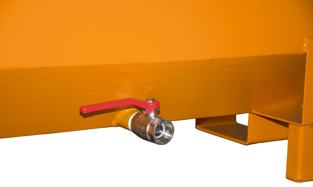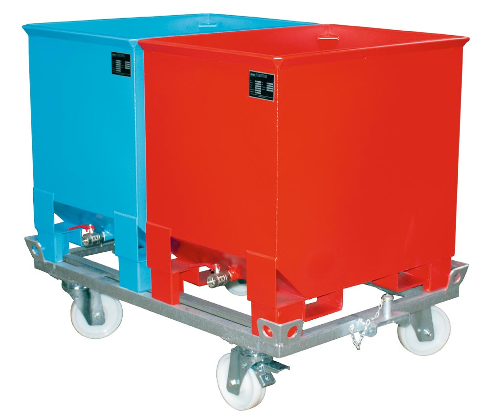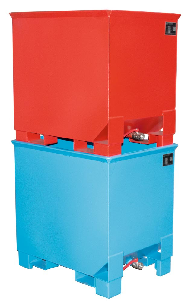 · Robuste Stahlkonstruktion mit glatten Innenwänden · Öl- und wasserdicht · 3-fach stapelbar auf 4 Stapelecken · Entleerung mittels Drehgerät