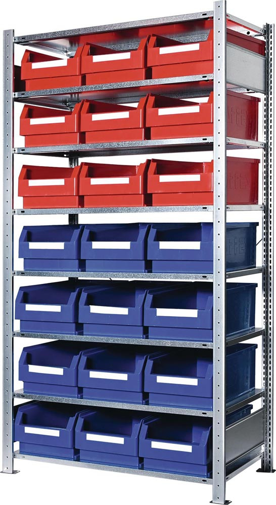 komplett mit Sichtlagerkästen Raster-Plan°· einfache und schnelle Steckmontage mit vormontierten verzinkten Rahmen · Fachböden verzinkt mit verstärktem Kastenprofil, H 25 mm, höhenverstellbar im 25-mm-Raster · Tragfähigkeit pro Fachboden 150 kg · Feldlast 1300 kg