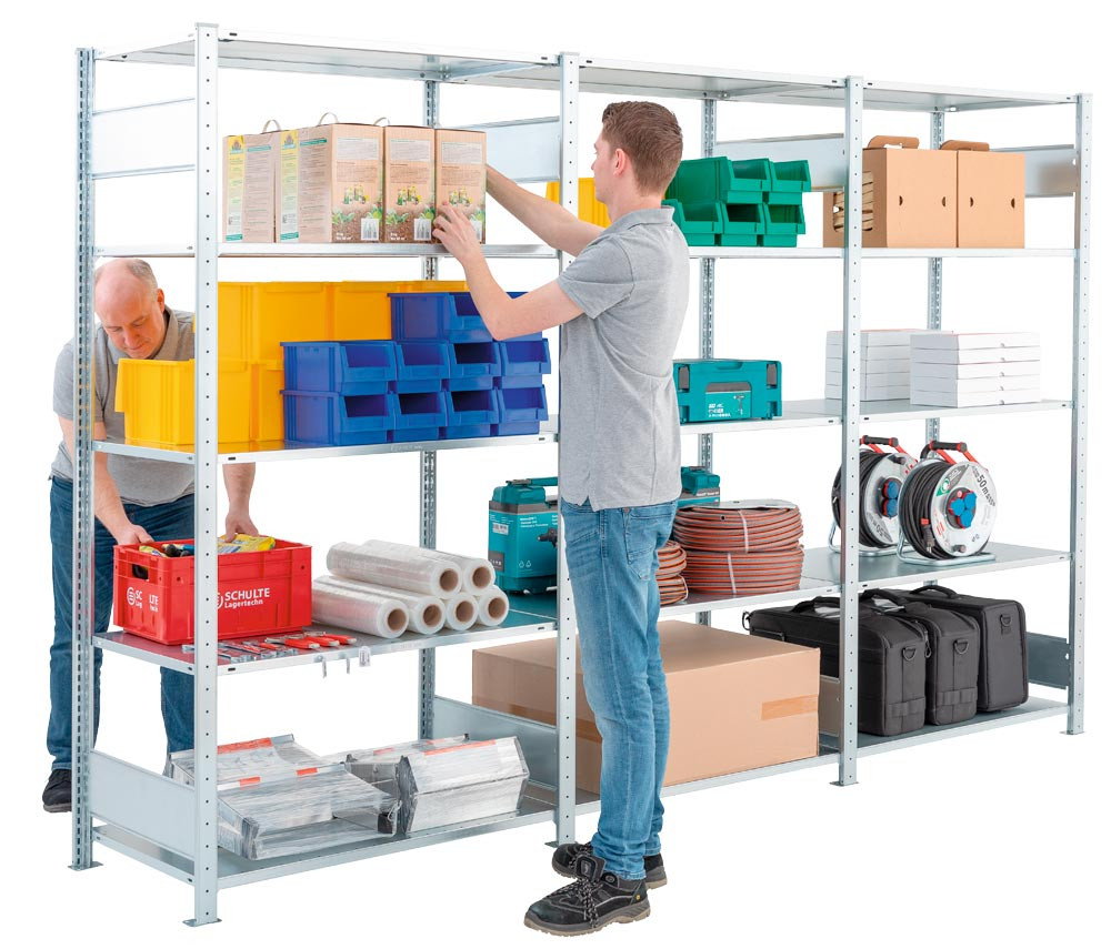 Steckregal-Set, 1 x Grundfeld + 2 x Anbaufeld, BxTxH 3000x400x2000 mm, Fachlast 150 kg, verzinkt, einseitig nutzbar E6479777