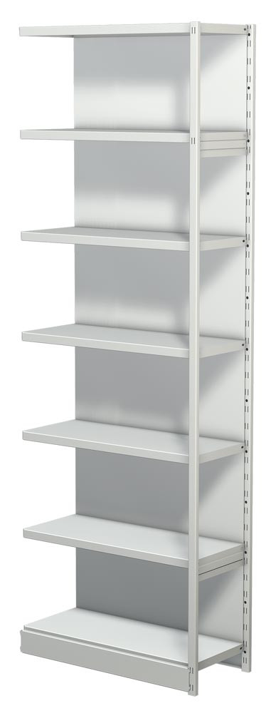 ∙ Optimale Raumausnutzung ∙ Fachböden 30 mm stark, im Raster von 59 mm höhenverstellbar ∙ Regalpfosten aus Kastenprofilen mit glatten Fronten ∙ Serienmäßig mit bodenbündiger Sockelblende ∙ Mit zusätzlichen Fachböden, Fachteilern, Seiten- und Trennstegen und Pendelhefterschienen individuell auszustatten ∙ Türen-Anbausätze, Seitenblenden und Zwischenwände ermöglichen die problemlose Integration von Schrankelementen ∙ Hochwertige Pulverbeschichtung in RAL 7035 lichtgrau