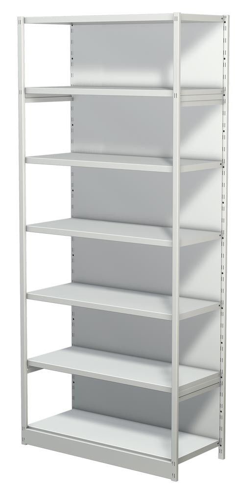 ∙ Optimale Raumausnutzung ∙ Fachböden 30 mm stark, im Raster von 59 mm höhenverstellbar ∙ Regalpfosten aus Kastenprofilen mit glatten Fronten ∙ Serienmäßig mit bodenbündiger Sockelblende ∙ Mit zusätzlichen Fachböden, Fachteilern, Seiten- und Trennstegen und Pendelhefterschienen individuell auszustatten ∙ Türen-Anbausätze, Seitenblenden und Zwischenwände ermöglichen die problemlose Integration von Schrankelementen ∙ Hochwertige Pulverbeschichtung in RAL 7035 lichtgrau