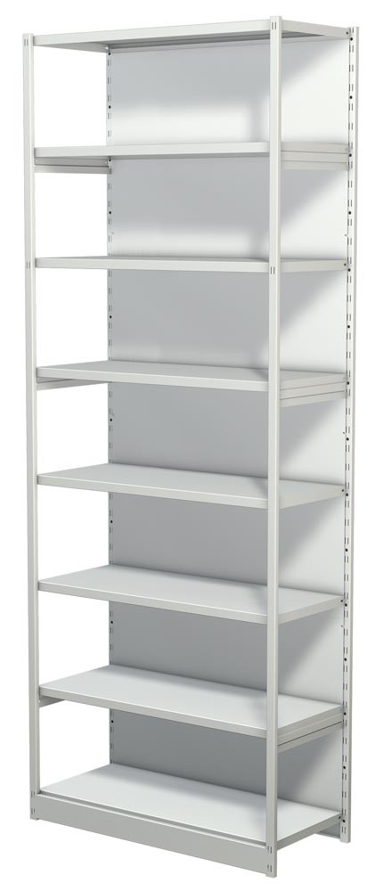 Steckregal mit Rückwand, Grundfeld, 8 Fachböden, 7 OH, BxTxH 960x300x2600 mm, lichtgrau E854477