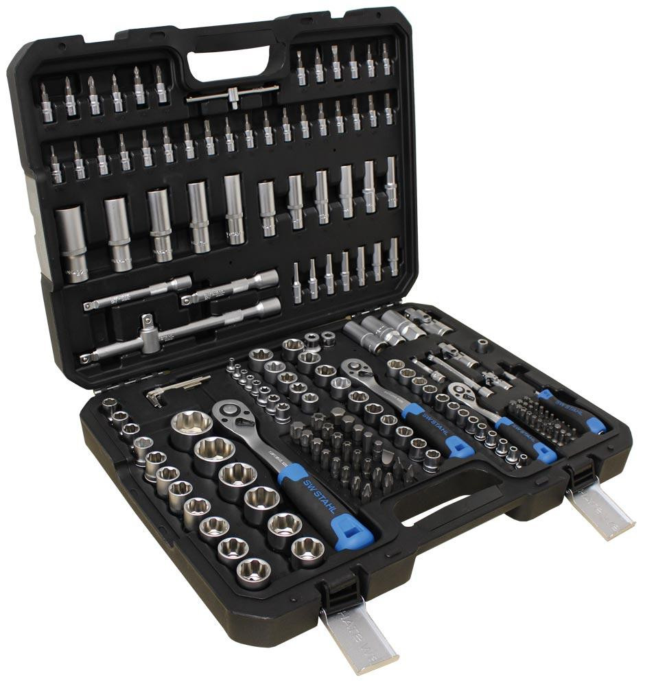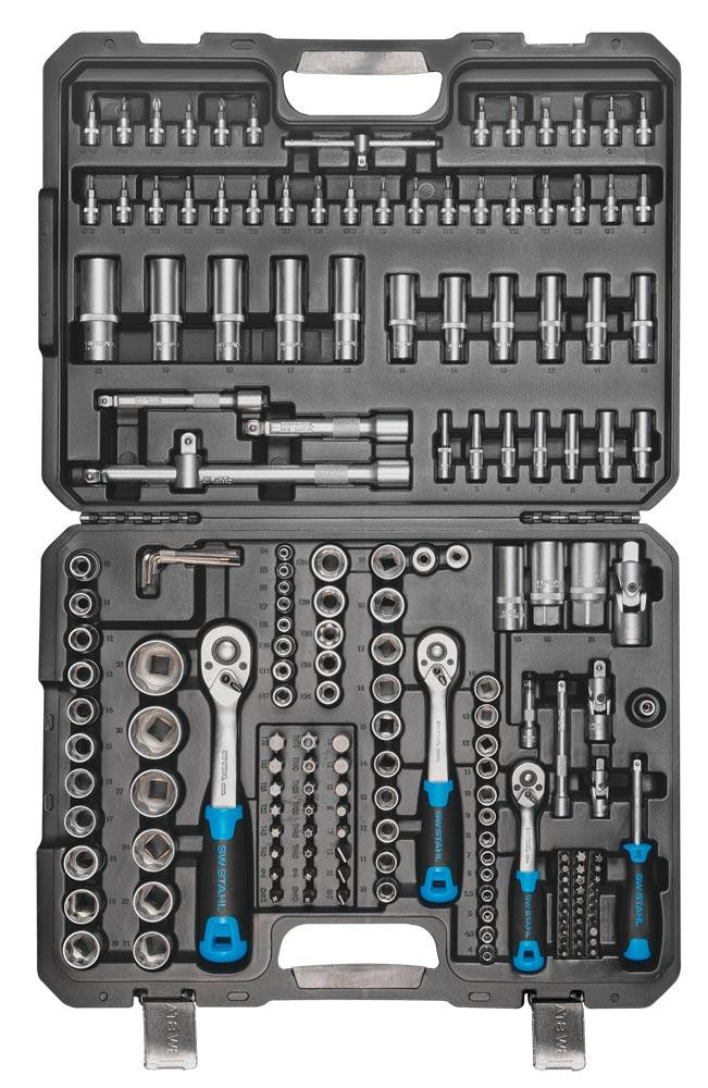 Steckschlüsselsatz bestehend aus Steckschlüssel-Einsätzen 4-32 mm, Steckschlüssel-Einsätze lang 4-22 mm, Schraubendreher-Bit-Einsätze Schlitz/Kreuzschlitz/Innensechskant/TORX® und Betätigungswerkzeugen 1/4", 3/8" und 1/2" ∙ Werkzeuge aus Chrom-Vanadium-Stahl ∙ Einsätze mit Sechskant-Wellenprofil ∙ Feinverzahnte Umschaltknarre (72 Zähne) mit 2-Komponenten-Griff ∙ Im robusten Kunststoff-Koffer