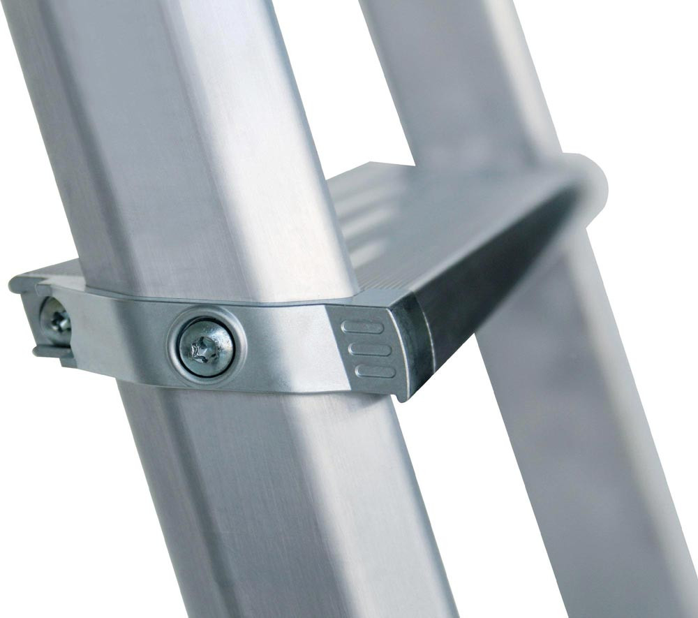 Aluminium · beidseitig begehbar · Stufen 80 mm tief geriffelt · geschraubte Stufen-Holmverbindung · robuste Scharniere · Stufenabstand 235 mm · Leiterneigung 70° · hohe Standsicherheit · rutschfeste Leiterschuhe · Spannverbindung durch hochfeste Polyestergurte · max. Gesamtbelastung 150 kg
