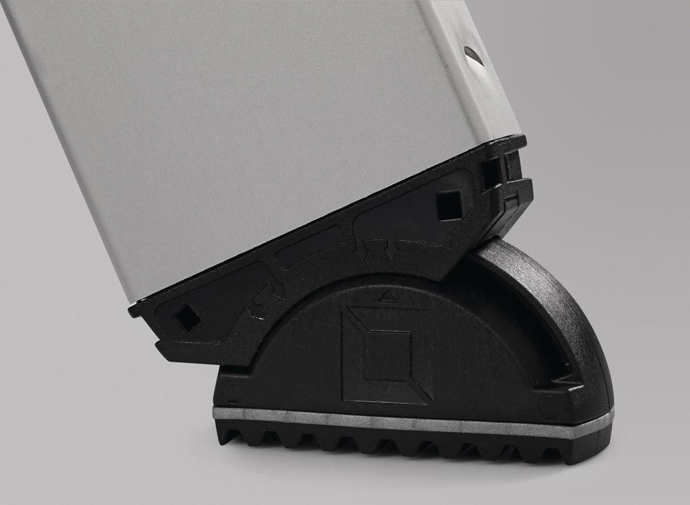 Aluminium · einseitig begehbar · stabile Rechteckrohr-Holme · 80 mm tiefe, geriffelte Stufen und große Plattform · Stufenabstand 235 mm · 4-fach gebördelte Stufen-/Holmverbindung · konische Holmführung für sicheren Stand · Leitergelenk "safe-cap" · ergo-pad® Griffzone mit Klemmmechanismus · nivello®-Leiterschuhe mit patentierter 2-Achsen-Neigungstechnik · praktische Ablageschale mit integrierten Haken und Werkzeugaufnahmen · Spreizsicherung durch zwei hochfeste Polyestergurte ab 7 Stufen · max. Gesamtbelastung 150 kg