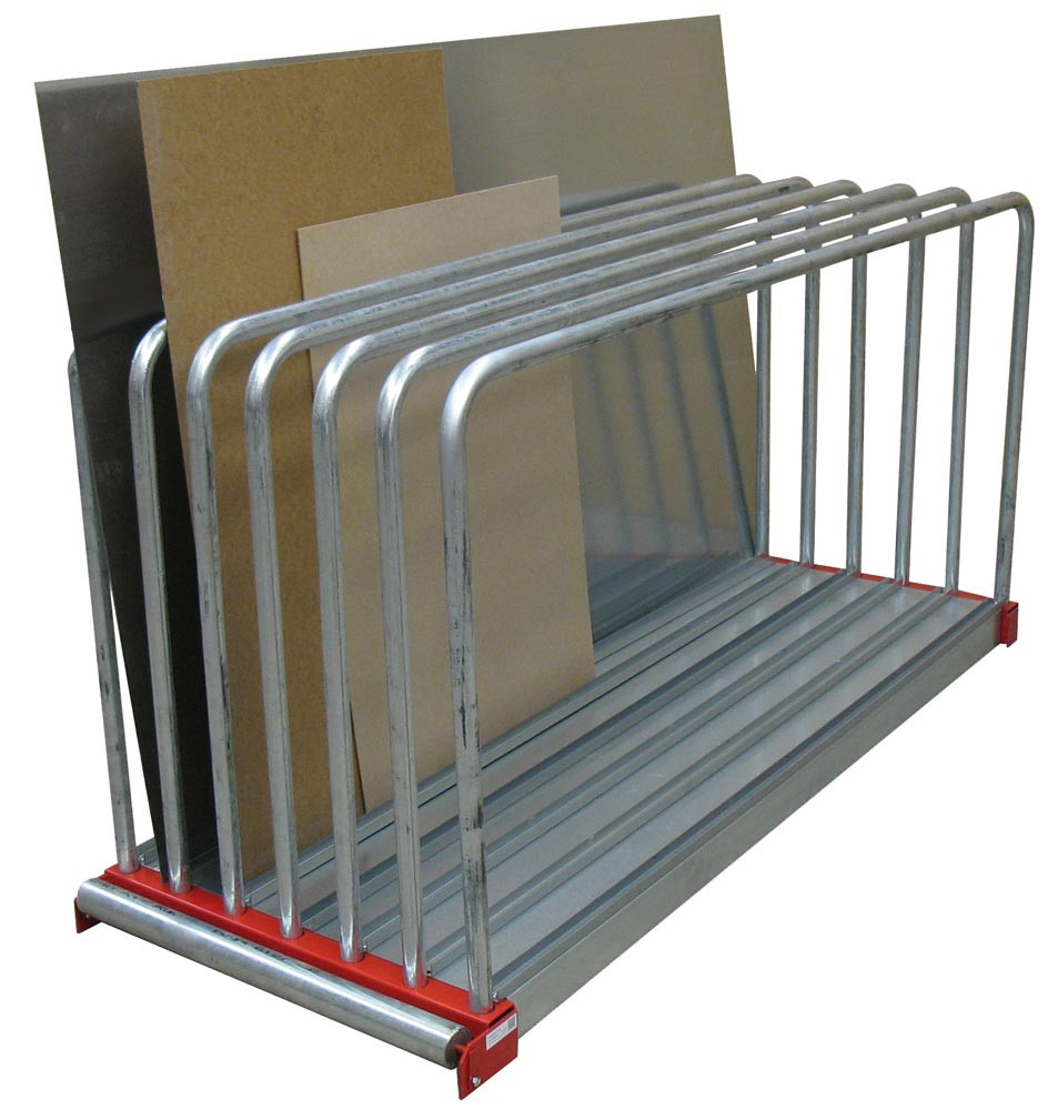 ∙ Stabile Stahlblech- und Vierkantrohrkonstruktion mit Führungsbügel ∙ Für eine übersichtliche Lagerung von Holz-, Kunststoff-, Blechtafeln und Pappe (bis 4 mm Stärke) ∙ Stirnseitig mit leichtlaufender Stahrolle zur einfachen Ein- bzw. Auslagerung