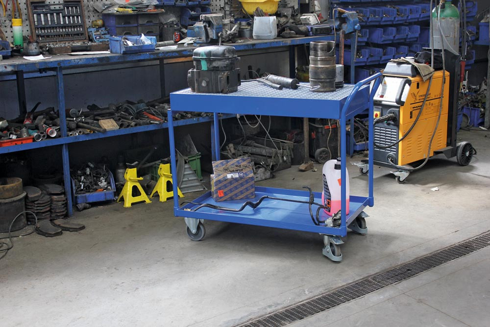 Tischwagen, 2 öldicht verschweißte Wannen, Ladefläche LxB 845x495 mm, Außenmaße LxBxH 985x500x910 mm, Traglast 400 kg, RAL 5010 enzianblau E1320552