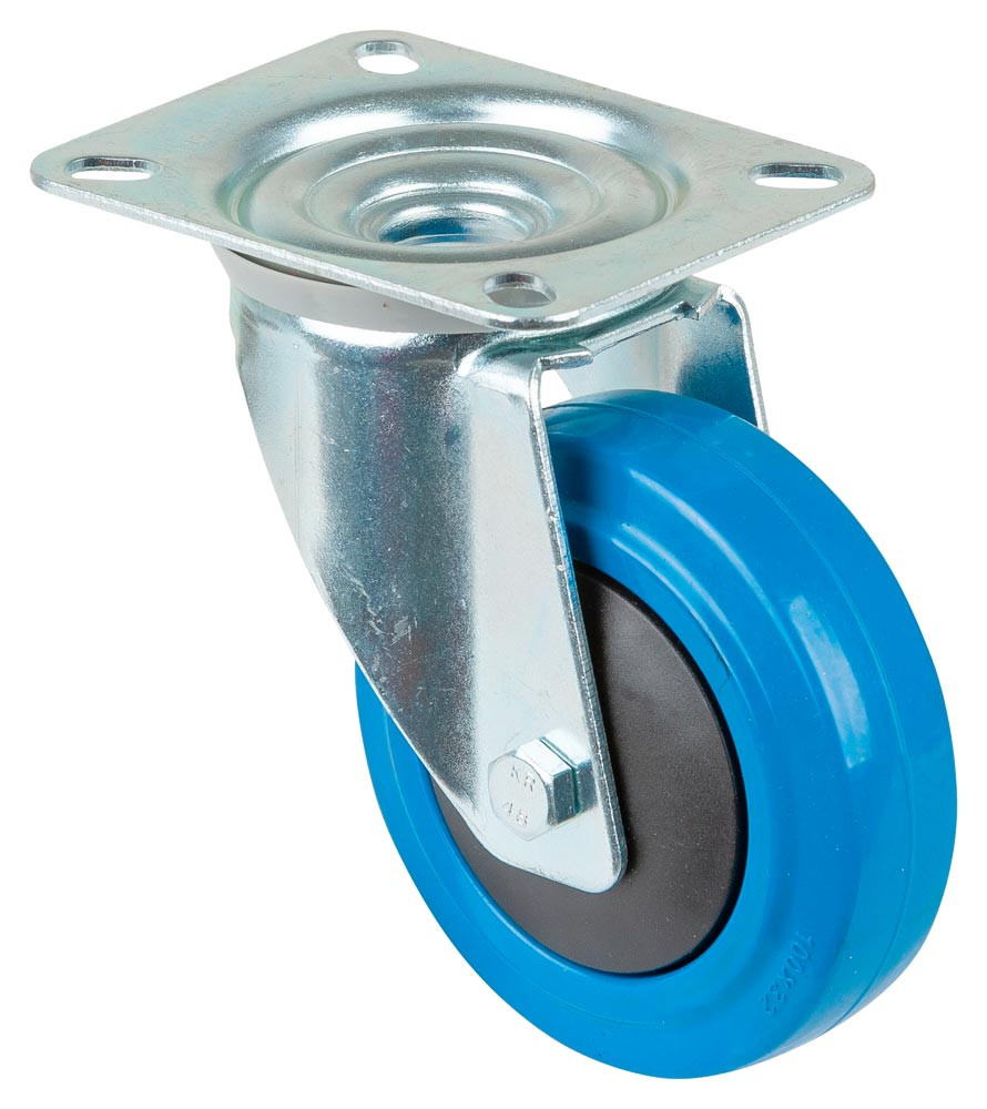 Transportgeräte-Lenkrolle, Elastik-Vollgummi blau, Durchm. 100 mm, Traglast 150 kg, Kugellager, Anschraubplatte, Fadenschutz E6485049