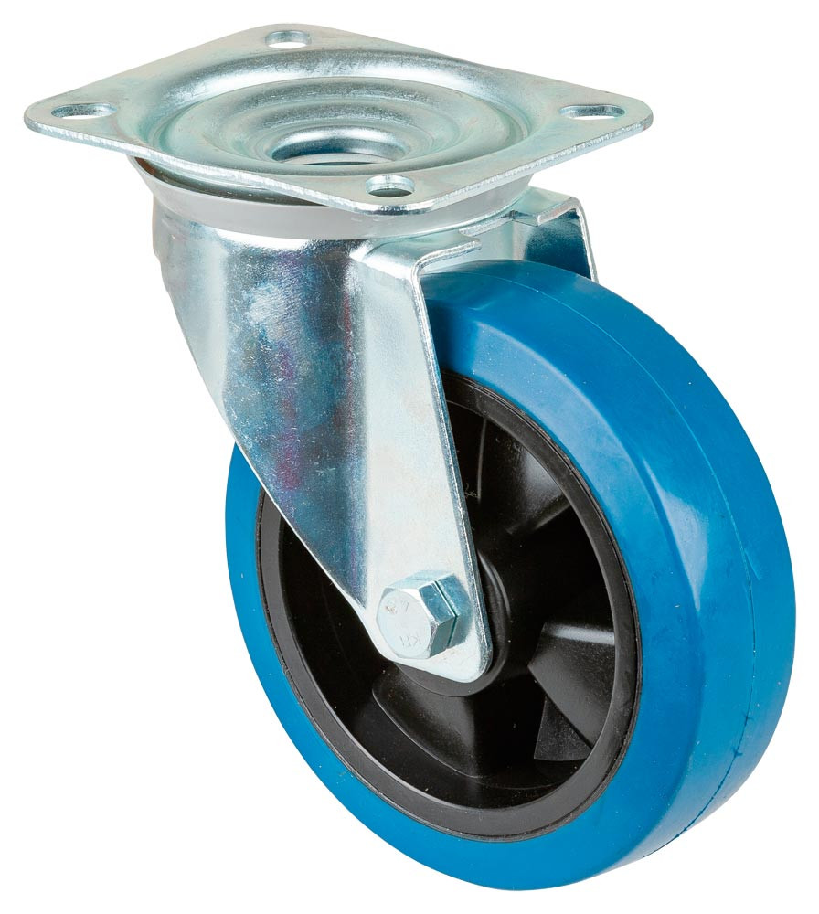 Transportgeräte-Lenkrolle, Elastik-Vollgummi blau, Durchm. 160 mm, Traglast 300 kg, Kugellager, Anschraubplatte