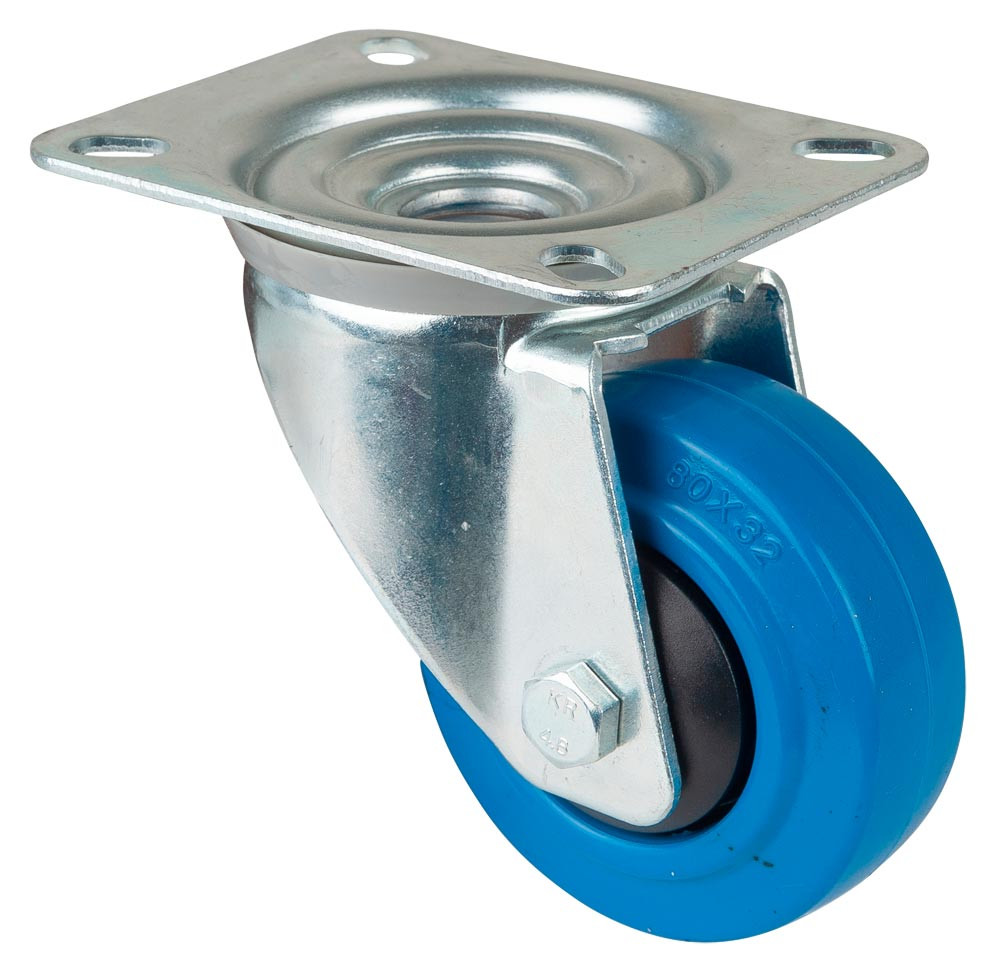 Transportgeräte-Lenkrolle, Elastik-Vollgummi blau, Durchm. 80 mm, Traglast 120 kg, Kugellager, Anschraubplatte, Fadenschutz