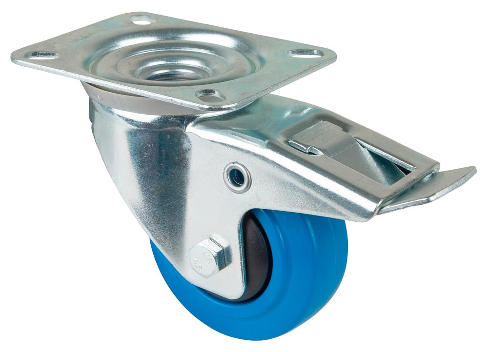 Transportgeräte-Lenkrolle m. Festst., Elastik-Vollgummi blau,Durchm. 80 mm, Traglast 120 kg, Kugellager, Anschraubplatte, Fadenschutz