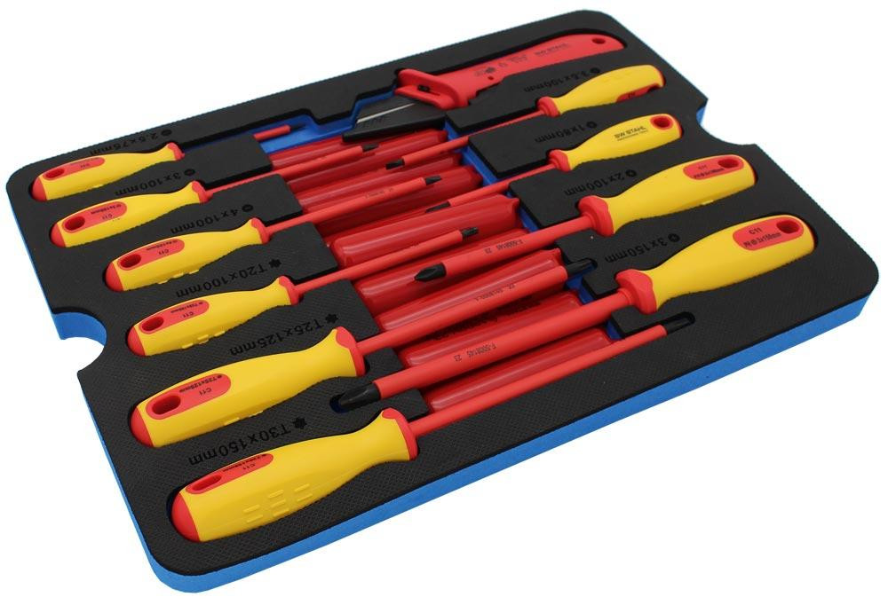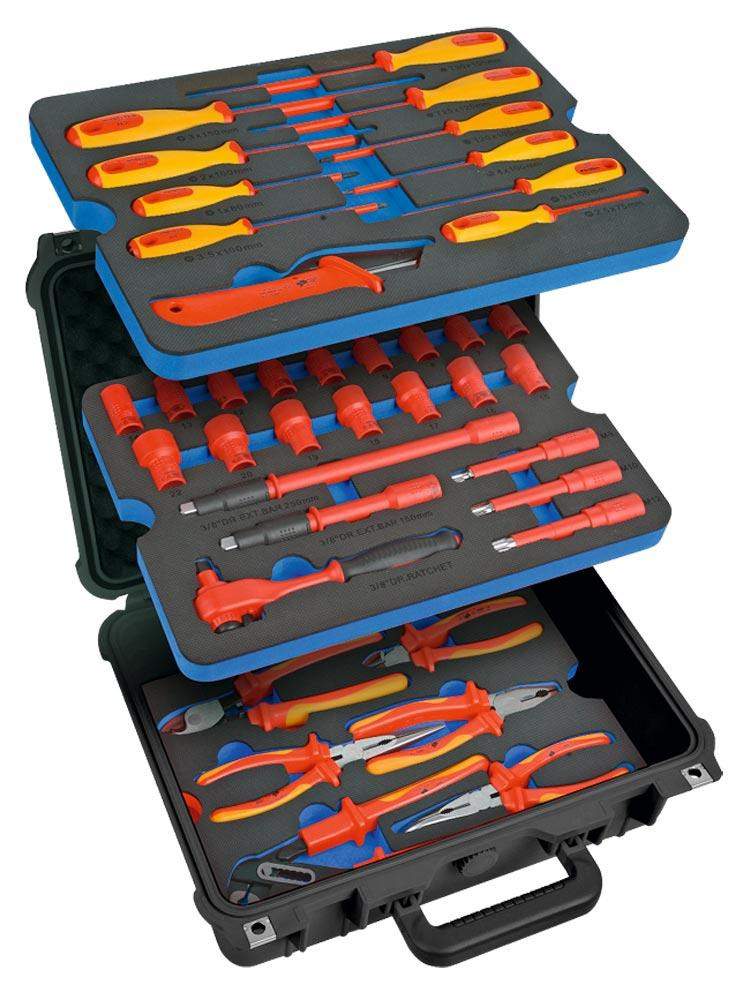 Lieferumfang: Isolierte Schraubendreher in folgenden Größen: PH1, PH2, PH3, T20, T25, T30, 2,5 - 3 - 3,5 - 4 mm ∙ Isolierte 10 mm (3/8") Steckschlüsseleinsätze in folgenden Größen: 6 - 7 - 8 - 9 - 10 - 11 - 12 - 13 - 14 - 15 - 16 - 17 - 18 - 19 - 20 - 21 - 22 mm ∙ Isolierte 10 mm (3/8") Schraubendreheinsätze in folgenden Größen: M8, M10, M12 ∙ Isolierte 10 mm (3/8") Verlängerungen in folgenden Größen: 150 und 250 mm ∙ Abisoliermesser Isolierte Wasserpumpenzange, 250 mm ∙ Isolierte Flachrundzange, gerade, 200 mm ∙ Isolierte Flachrundzange, gebogen, 200 mm ∙ Isolierte Kabelschere Isolierte Kombizange, 180 mm ∙ Isolierter Kraftseitenschneider, 160 mm ∙ 10 Isolierkappen Isolierte Knarre, 10 mm (3/8") im Kunststoffkoffer