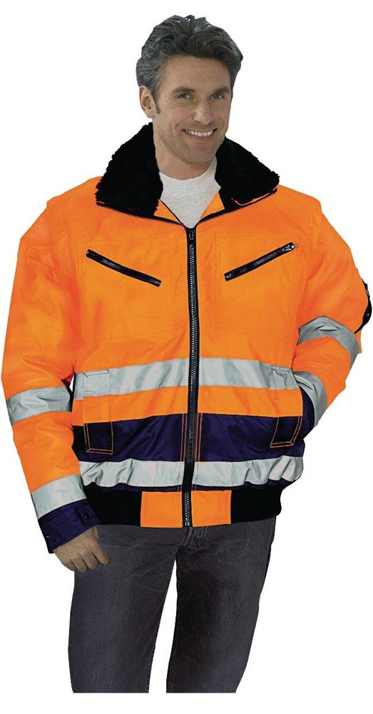 2-farbig · EN 20471 Kl. 3 mit Ärmeln, Kl. 1 ohne Ärmel und EN 343 Kl. 3/1 · 100% Polyester mit PU-Beschichtung · alle Nähte verschweißt, dadurch wasser-, windabweisend und atmungsaktiv · Kapuze im Kragen einrollbar · abnehmbare Ärmel und Kragen, heraustrennbares Faserpelzfutter · 4 Außentaschen, 1 Innentasche · 1 Ärmeltasche