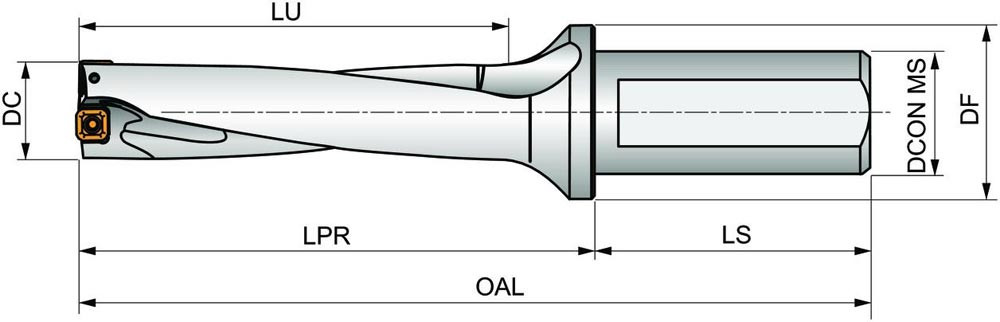Wendeschneidplattenbohrer zum einsetzen von einer XPET 1504.. Wendeschneidplatten als Zentrumschneide und einer SCET 1204.. Wendeschneidplatte als Außenschneide · Bohrdurchmesser 44mm · mit einem 40mm abgeflachten Zylinderschaft nach ISO 9766 und Innenkühlung für maximale Bohrtiefen bis 4 x D
