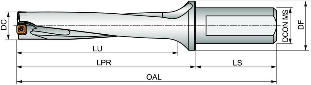 Wendeschneidplattenbohrer zum einsetzen von einer XPET 0602.. Wendeschneidplatten als Zentrumschneide und einer SCET 0502.. Wendeschneidplatte als Außenschneide · Bohrdurchmesser 19mm · mit einem 25mm abgeflachten Zylinderschaft nach ISO 9766 und Innenkühlung für maximale Bohrtiefen bis 5 x D