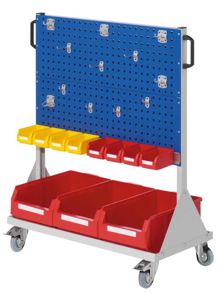Werkstattwagen, 2 Lochpl. je Seite, Hakensort. 12-tlg., div. Kästen, Zubehör, BxTxH 1000x500x1230 mm, RAL 7035/5010 E848694