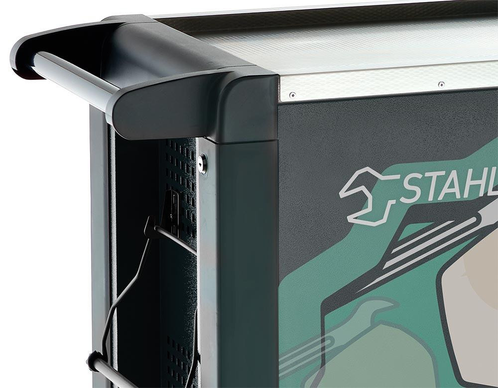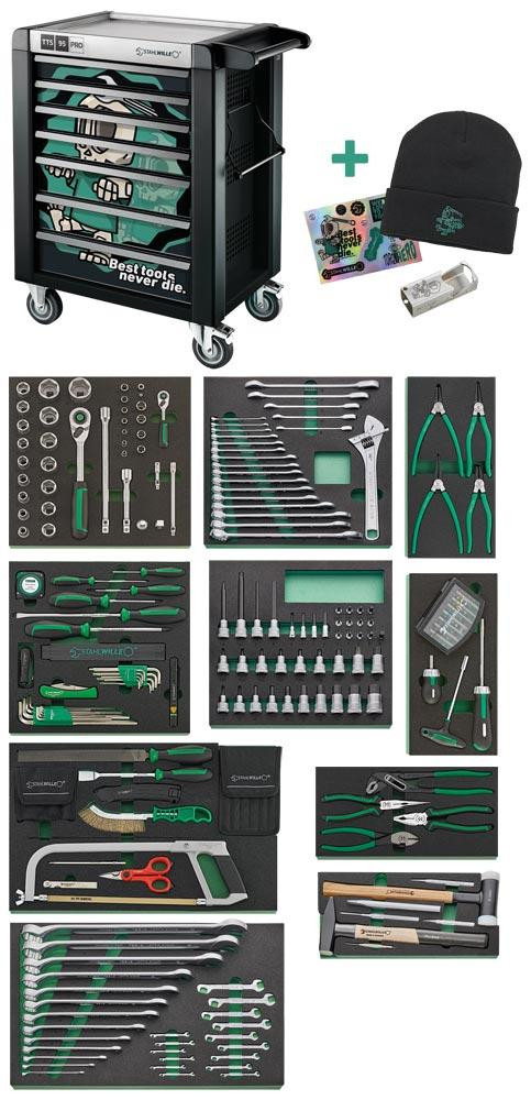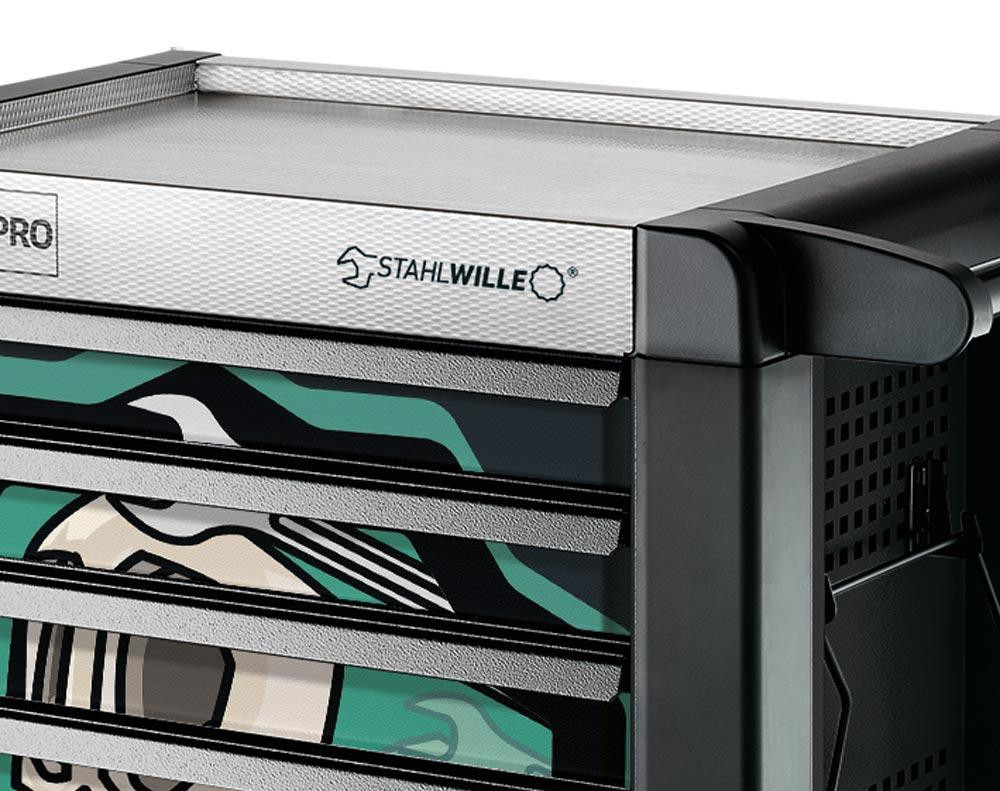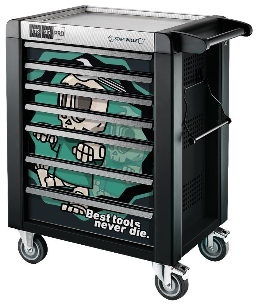 Robuster Werkstattwagen mit 250-teiligem Werkzeug-Sortiment für vielfältige Anwendungsfälle im Betrieb oder im industriellen Einsatz ∙ Exklusive UV-Lackierung im Sonderdesign "Best tools never die" ∙ 7 große Schubladen mit Vollauszug sorgen für eine effiziente Organisation von Werkzeug und Material ∙ Öl- und säurebeständige, kugelgeführte Leichtlaufräder (Rollen-Ø125 mm) mit Fadenschutz ∙ Beidseitige Lochraster