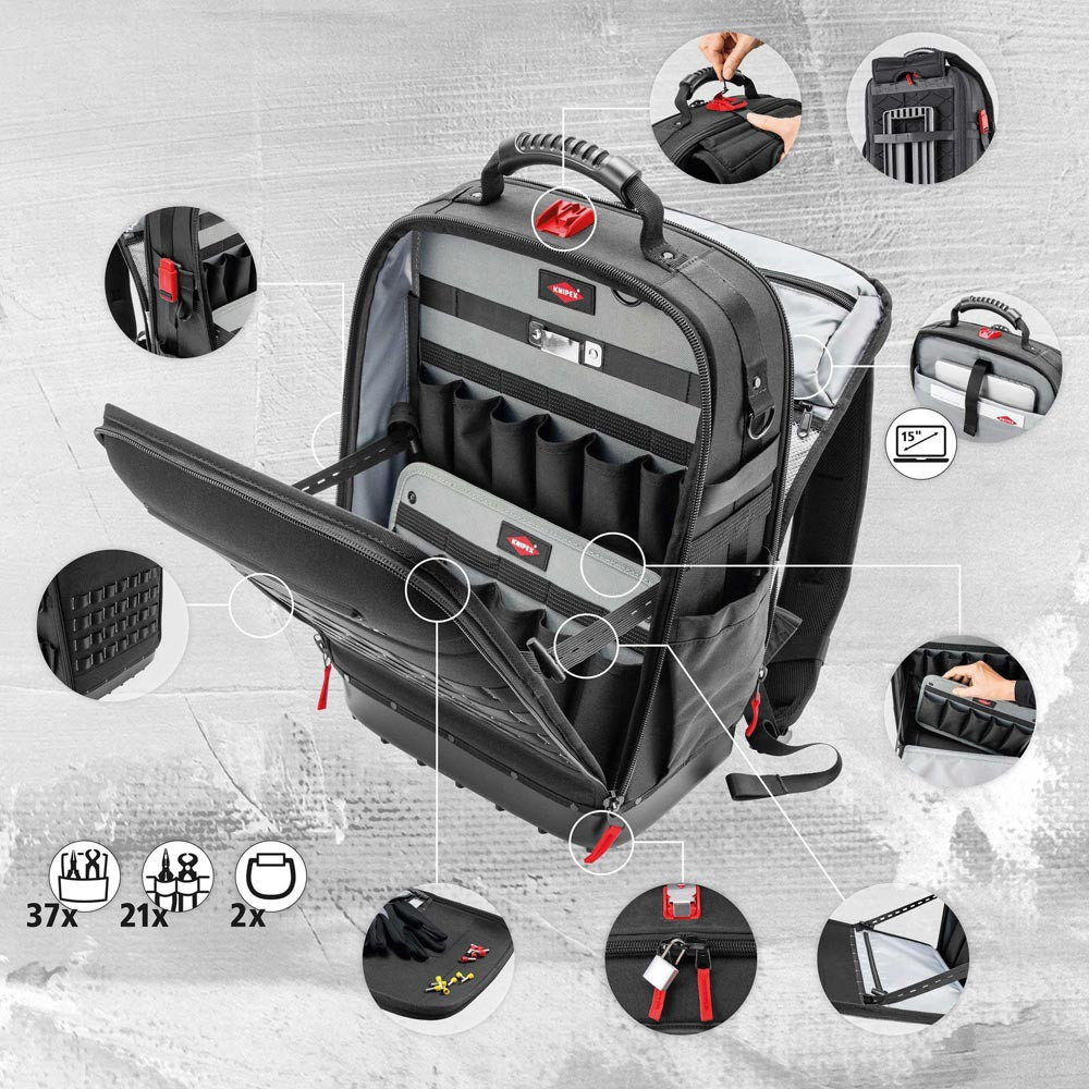 mit 16 KNIPEX-Werkzeugen - insgesamt 22 Markenwerkzeugen · teilweise VDE-geprüft nach DIN EN 60900 · komplett aufklappbare Vorder- und Rückseite, herausnehmbare Werkzeugtafel und ergonomische Rückenpolsterung · innovative FIDLOCK®-Adapter und MOLLE-Bänder · 2 separaten Innenfächern für Werkzeug, Messgeräte, Notebook oder Tablet · max. Zuladung: 15 kg · 18 l Fassungsvermögen · widerstandsfähiges Gewebe aus nachhaltigen Recycling-Kunstfasern: spritzwassergeschützt und leicht zu reinigen · wasserdichte Bodenschale aus schlagfestem Kunststoff für stabilen Stand im geöffneten und geschlossenen Zustand, 6 cm hoch · innen 1 und außen 4 MOLLE-Bänder zur Befestigung von beliebigen Adaptern, Karabinern, Zubehör je nach Bedarf · schnelle FIDLOCK®-Verbindungen sind im Handumdrehen befestigt oder gelöst · mit insgesamt 21 Haltelaschen und 37 Taschen, teilweise mit Reißverschlüssen · mit Kofferlasche zur Fixierung an Teleskopgriffen von Werkzeugkoffern (H x B x T: 53 x 34 x 21 cm) · Leergewicht 2,9 kg · geprüfte Belastbarkeit bis 15 kg Werkzeuggewicht - Abmessung Breite außen (innen): 340mm - Abmessung Höhe außen (innen): 210mm - Abmessung Tiefe außen (innen): 530mm